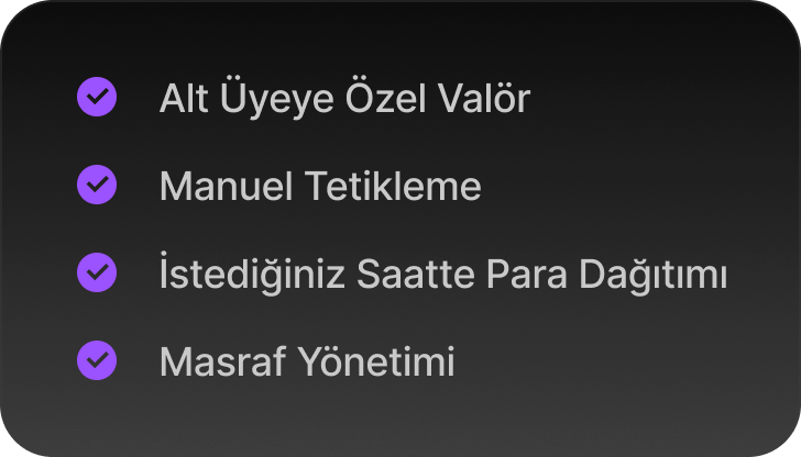 Gelişmiş Yapılandırma ile üye bazlı valör tanımlayın, ödemeleri manuel tetikleyin, istediğiniz saatte para dağıtımı yapın ve masrafları etkin şekilde yönetin.